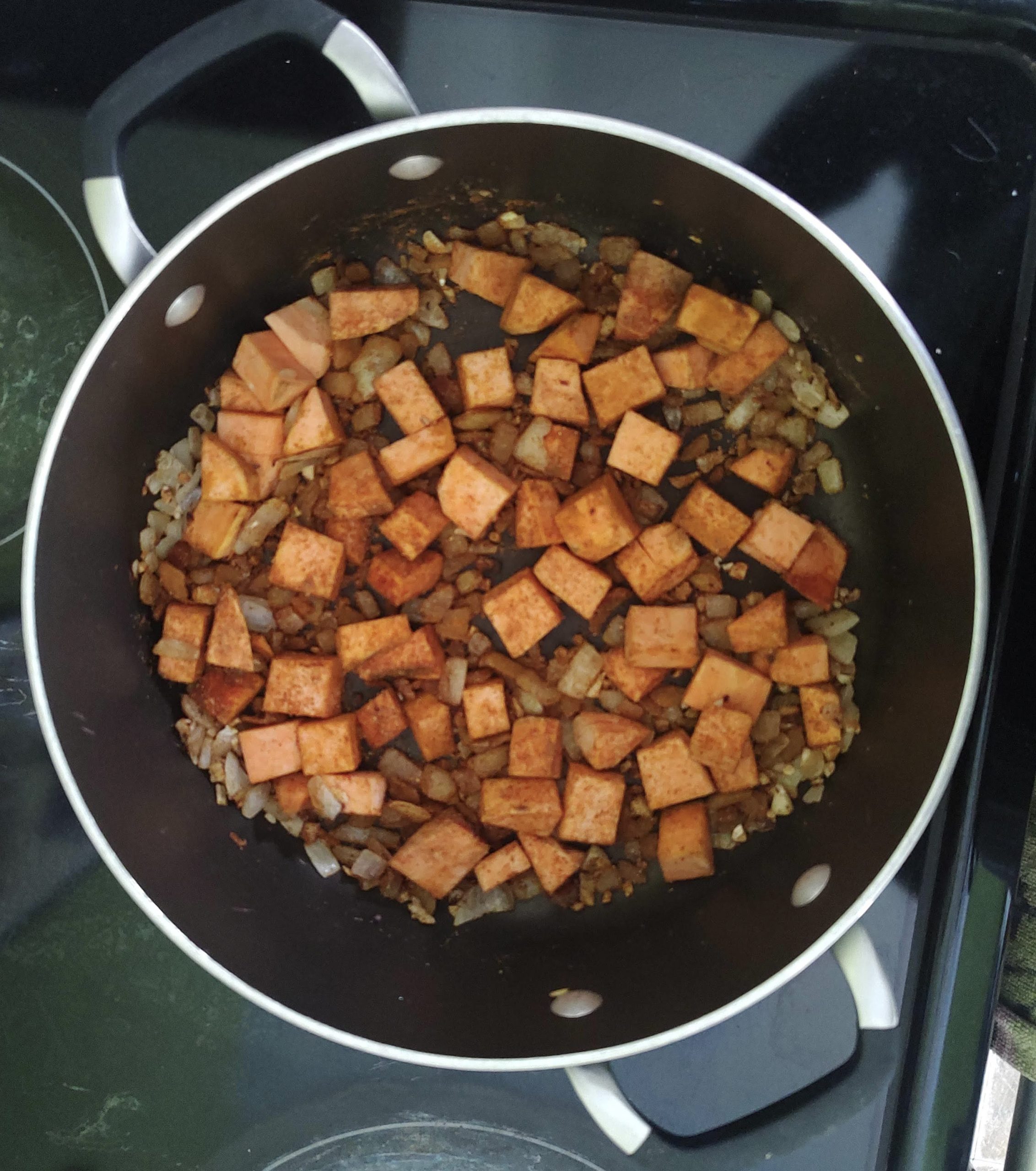 - To the onion and garlic add the sweet potato, cumin, turmeric, coriander and smoked paprika. Stir constantly until the spices have coated the veggies and are fragrant.
