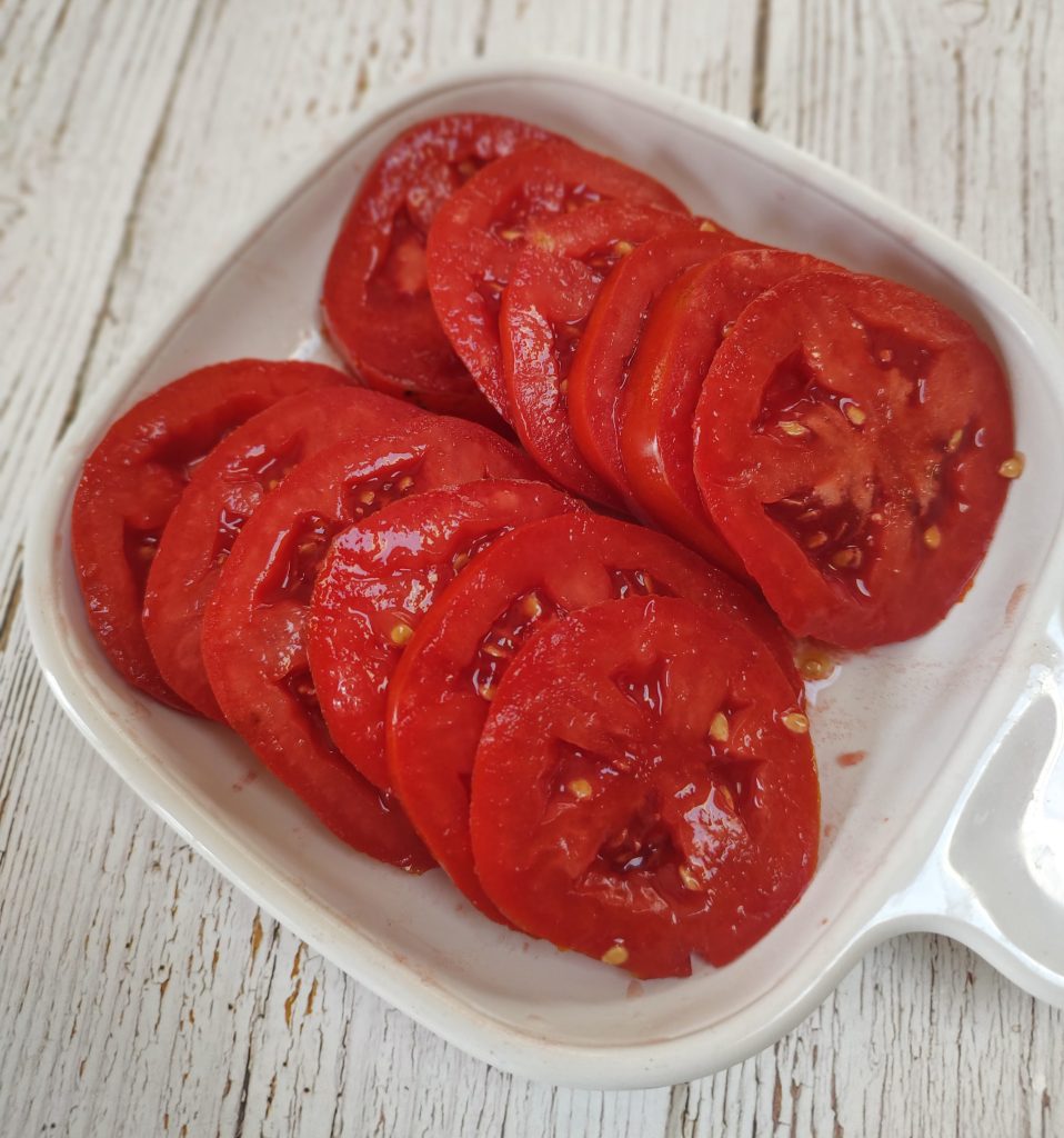 Thoroughly wash all of your produce.Using a sharp knife, slice rounds of zucchini about ¼” thick. Slice the tomatoes into uniform ¼” thick slices. Set the sliced tomatoes aside.